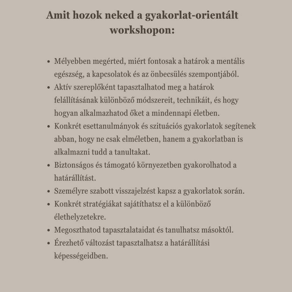 A workshop gyakorlati jellegű, ezért a helyek száma korlátozott. Fontos számomra, hogy minden résztvevő személyre szabott figyelmet kapjon. Tudom, hogy mennyire nehezen nyíltok meg a személyes elakadásaitokkal kapcsolatban, ezért is készültem olyan határállítási gyakorlatokkal, amelyek viszonylag gyakran fordulnak elő, így nem nektek kell felhozni a gyakorlatok témáit. Viszont az is lehet, hogy pont egy olyan határállítási kérdés gyötör, amit nagyon szeretnél megoldani. Neked azt ajánlom, hogy írd meg nekem előre, és természetesen a személyedet titokban tartva beépítem a workshop gyakorlatai közé.