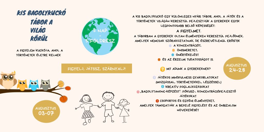 Mindig szeretnénk valami újdonságot adni a gyerekeknek, amellett, hogy az alapkoncepció állandó: a figyelmi kapacitás, az önismeret és az érzelmi tudatosság fejlesztése egész éves működésünket meghatározza. Mindig játékos fomában, hogy a gyerekek ne érezzék tehernek, valami kötelező dolognak. A nyári táborok során pedig még inkább a felhőtlen szórakozás, a képzelet szárnyalása, az alkotás öröme kerül a középpontba.